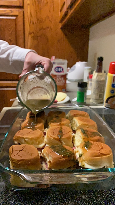 Mix together butter, Worcestershire sauce, parsley, sugar, and onion powder in a small bowl. Pour the mixture evenly over the sandwiches. Take a spoon and spread the mixture over the top of the rolls.